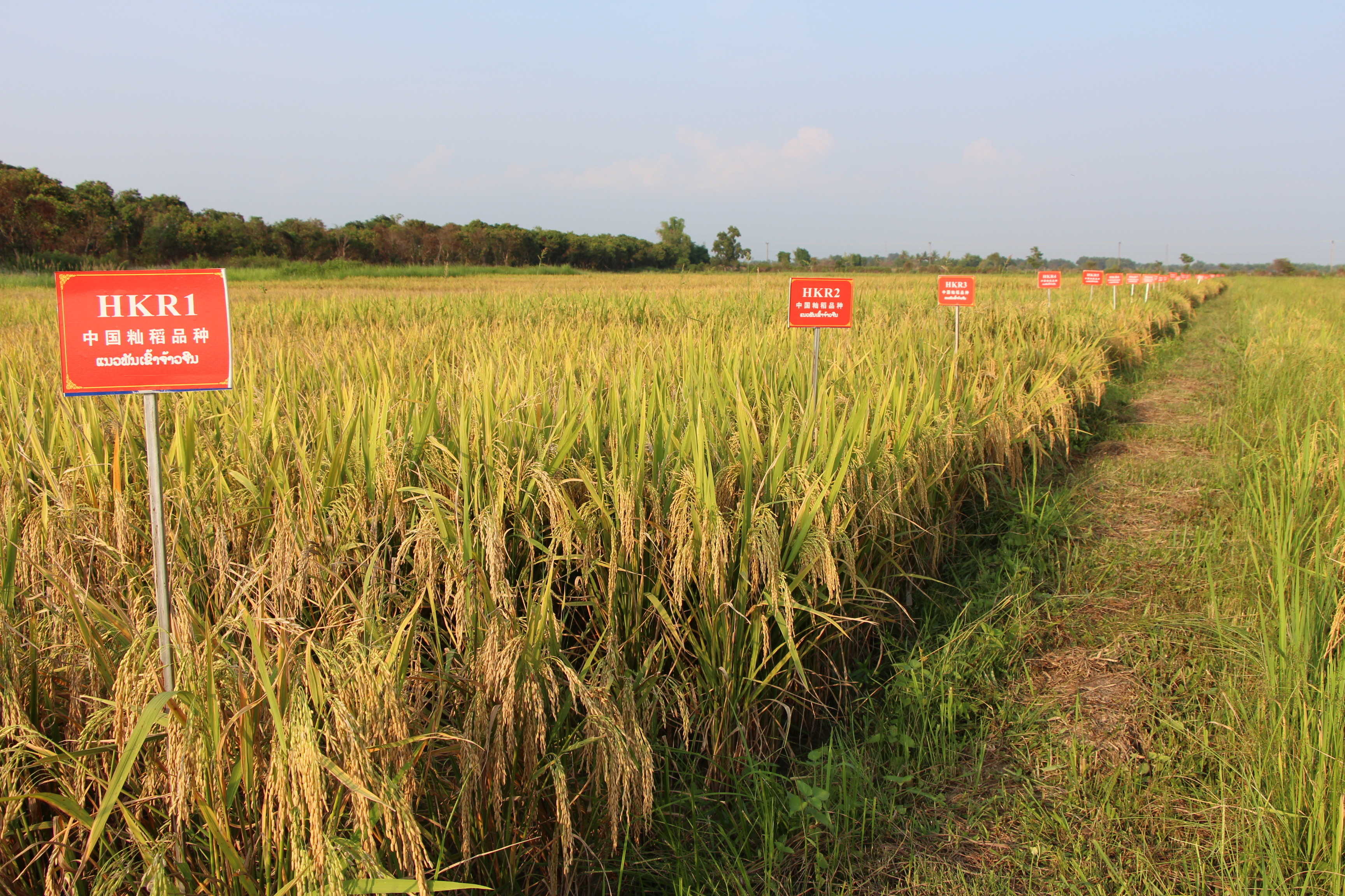 由广西农业职业技术大学承建的中-老合作农作物优良品种试验站在老挝当地开展水稻品种对比试验
